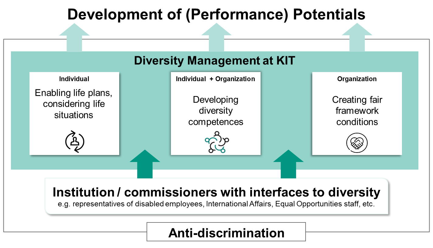 At KIT, we are aware of the diversity of our employees and students and actively promote it - because it is precisely this diversity that is an important basis for scientific progress and excellence. Science in particular thrives on diverse approaches, perspectives and expertise in order to meet the global challenges of our time, such as the energy crisis, climate change or the question of what the mobility of the future will look like. The opportunity for all employees to fully exploit their potential, to work with satisfaction at KIT and to participate in the development of KIT is at the heart of the diversity-oriented culture at KIT. We therefore actively promote equal opportunities and diversity, support the individual life plans and needs of our employees, create a working environment with fair and transparent framework conditions and develop our employees into competent top performers.